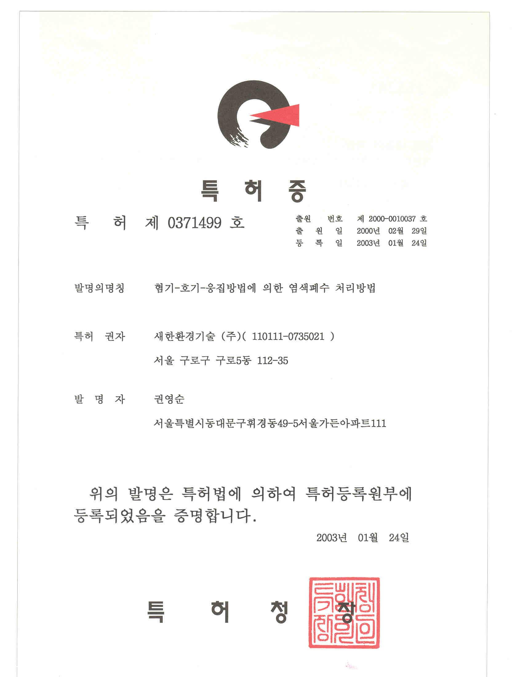| 특허증 | 폐수처리장치(ACE) | 폐수처리 | 제10-0360535호 | 2002년 10월 29일 | VIEW |