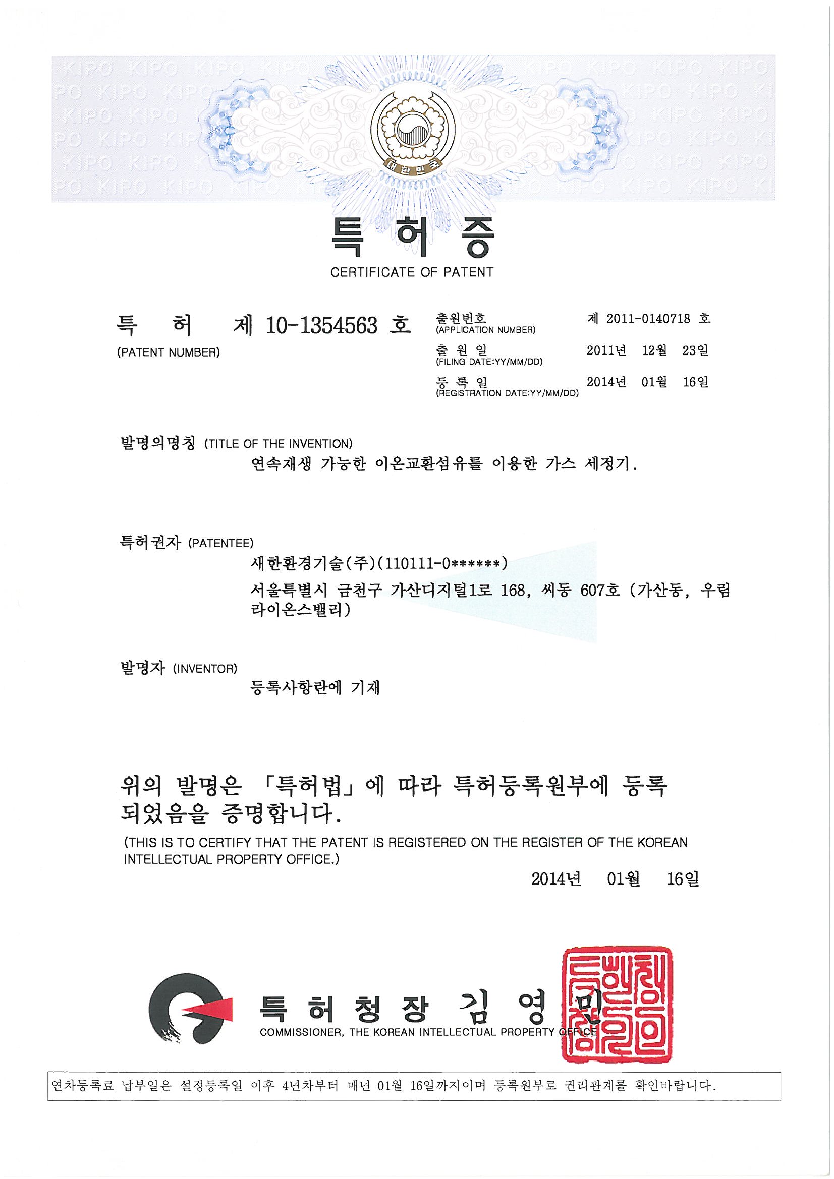 | 연속재생 가능한 이온교환섬유를 이용한 가스 세정기 | 가스정제 | 제10-1354563호 | 2014년 01월 16일 | VIEW | |